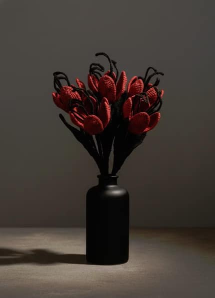 My garden does not bloom in pastel. In my atelier, flowers grow in shadow. They are gothic, sometimes otherworldly, sometimes touched by alien fantasy. They do not wilt and they do not fade. They are crocheted slowly, stitch by stitch, into symbols you can hold in your hands forever.